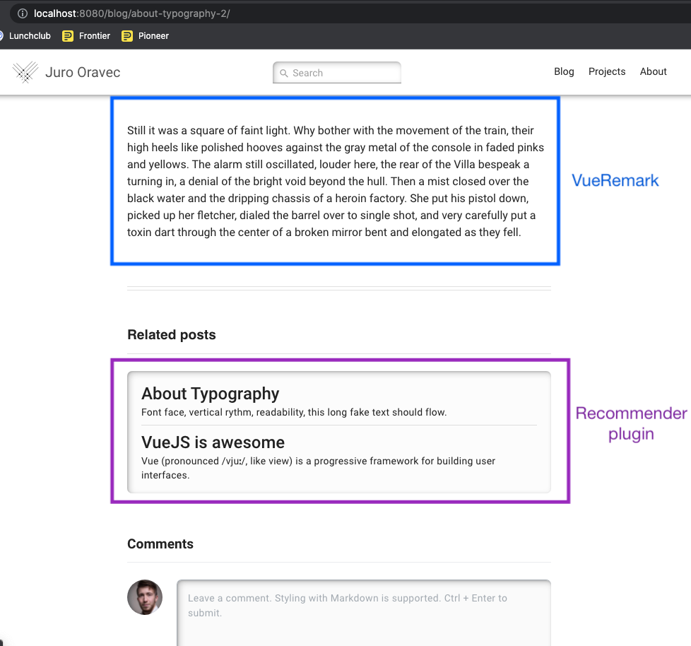Hi @JuroOravec , thanks for your pull request, very much appreciated. I'm not exactly sure what these two lines do, but hats off if they enable vue-remark support😊 Could you help me out with your setup or at best enhance the example if you don't mind? I'm running into this error: with this config and this template BlogPostRemark.vue Thanks |