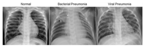 The normal chest X-ray (left panel) depicts clear lungs without any areas of abnormal opacification in the image. Bacterial pneumonia (middle) typically exhibits a focal lobar consolidation, in this case in the right upper lobe (white arrows), whereas viral pneumonia (right) manifests with a more diffuse ‘‘interstitial’’ pattern in both lungs.