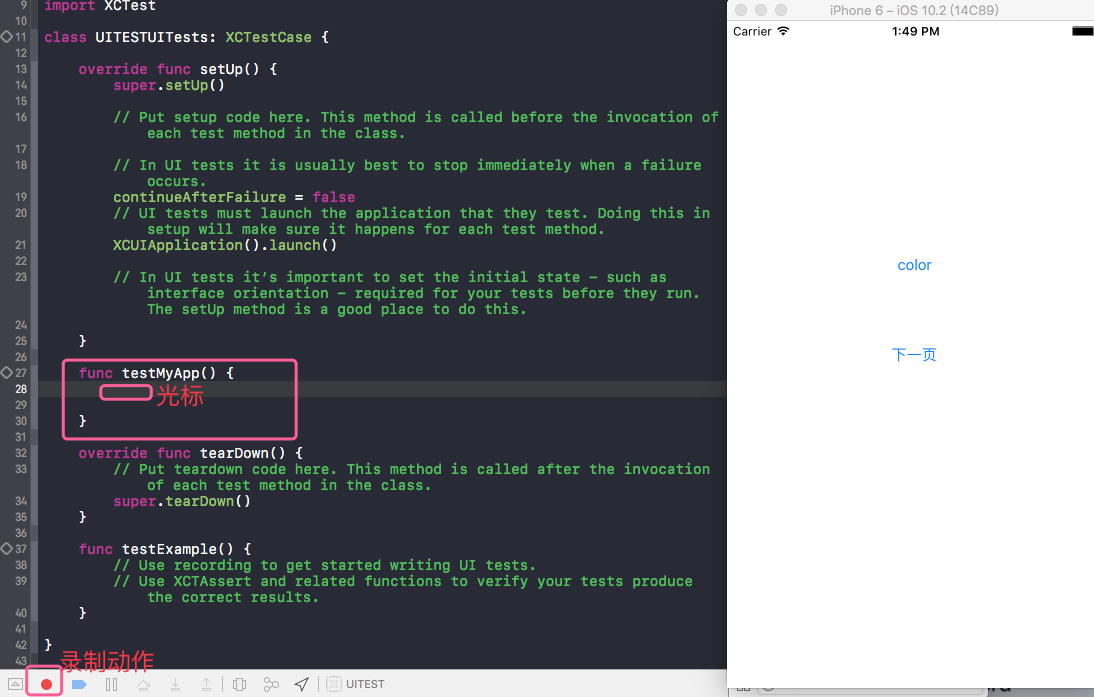 }使用的方法是,先创建一个测试方法,然后将光标停留在方法中,然后点击录制.和 app 的交互就会被自动转写成代码.