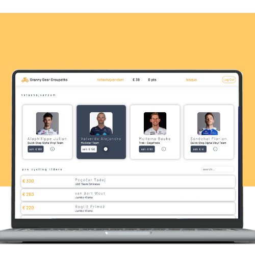 This cycling fantasy league application allows users to create accounts, buy and sell cyclists from a ranked list of over 2,200 riders, and earn points each night based on which riders were on their roster the day before the race.