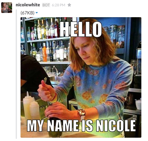 /meme https://nicolewhite.github.io/images/me.jpg hello; my name is nicole;