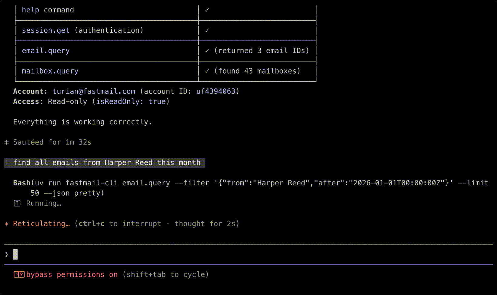 uvx fastmail-cli helpexport FASTMAIL_API_TOKEN="fmu1-..." # from Fastmail Settings → Integrations# Read