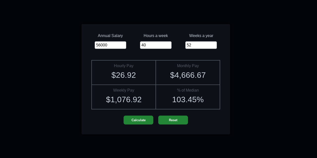 A simple calculator that will take your annual salary and convert it into your hourly, monthy, and weekly salary. It will also compare that salary to the median US salary. It will break if you input a high enough number.