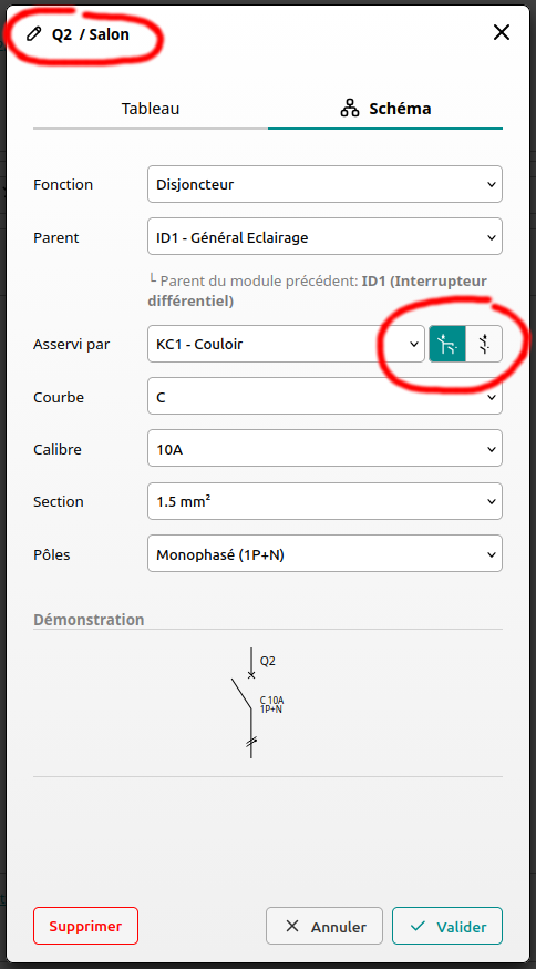 Pour ce faire, dans les propriétés du disjoncteur Q2, nous remplaçons le libellé 'Couloir' par 'Salon' puis dans les propriétés du schéma, nous indiquons un asservissement partiel.