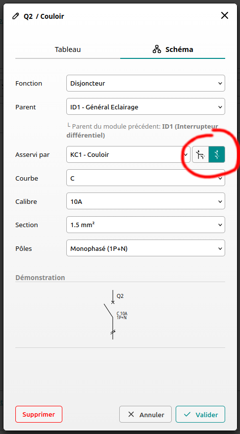 Vous remarquerez le choix du type d'asservissement. Dans notre exemple, le disjoncteur Q2 ne protège que le circuit 'Eclairage couloir', donc c'est un asservissement total.