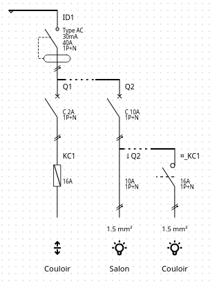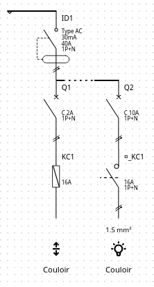Le disjoncteur Q1 protège la bobine du télérupteur KC1. Le disjoncteur Q2 protège l'éclairage couloir, le télérupteur KC1 asservi le disjoncteur Q2.