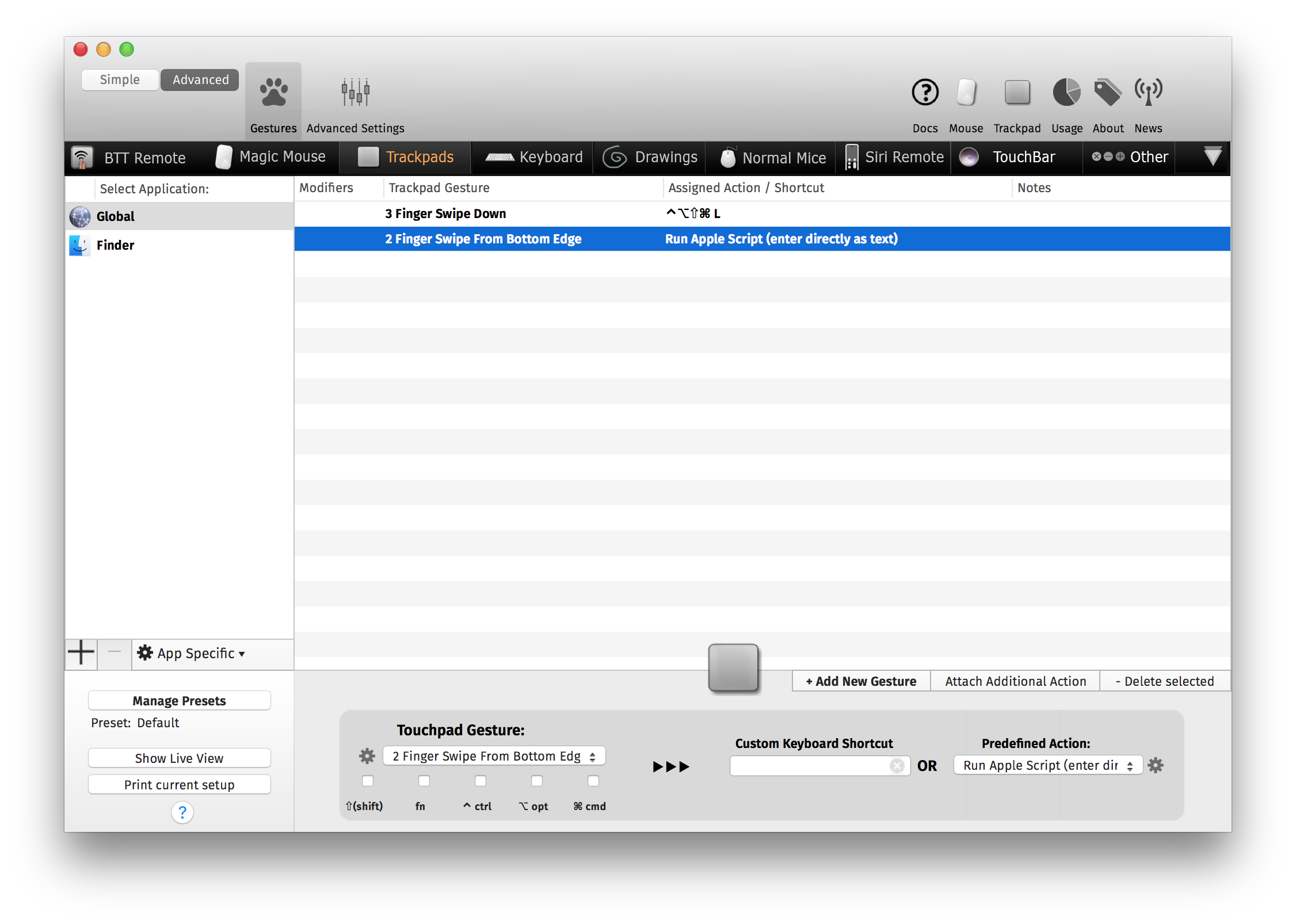 Better Touch Tool or any software for binding apple script to keyboard shortcut / trackpad gesture