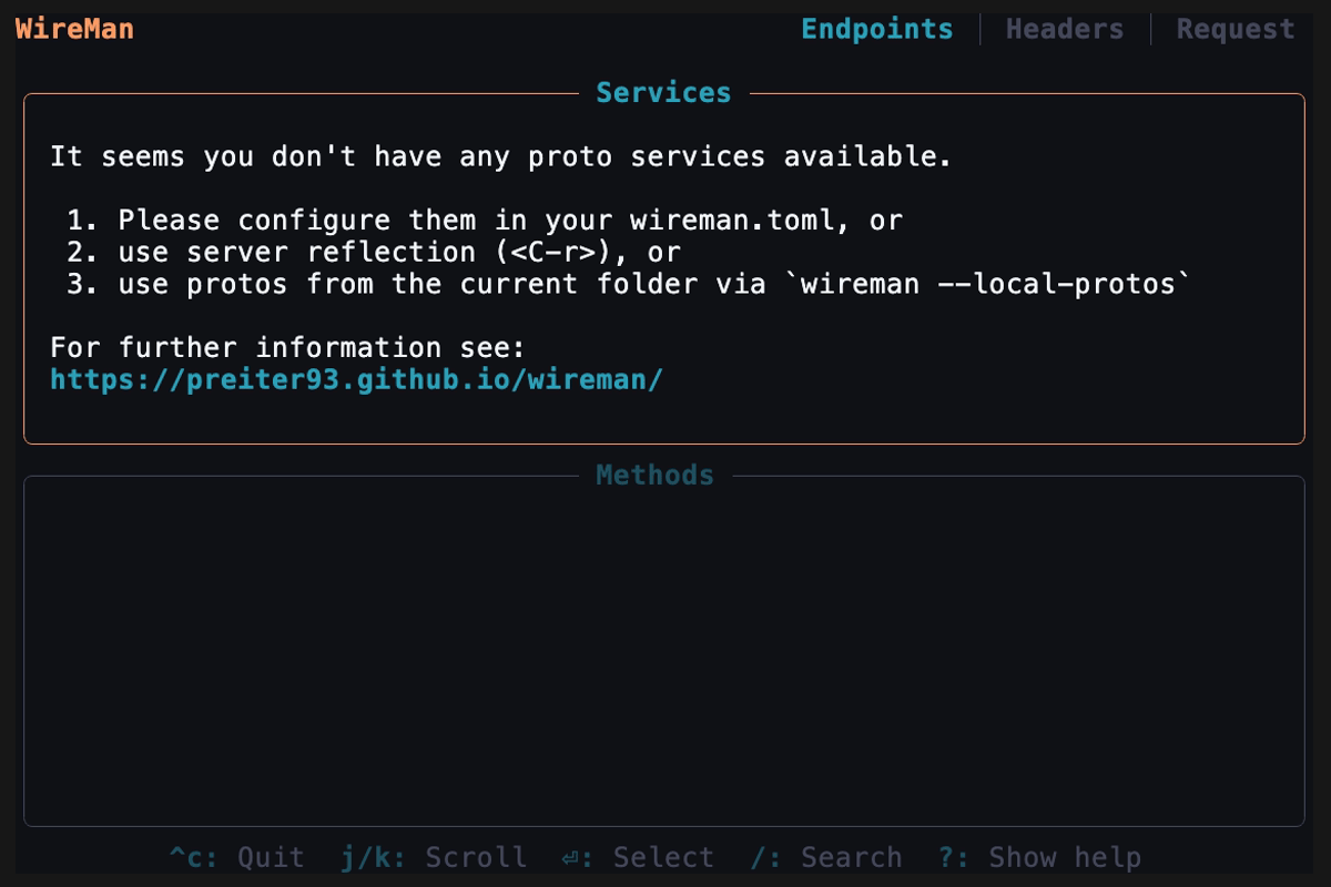 The first page of Wireman will list your grpc services and their methods. You can navigate with