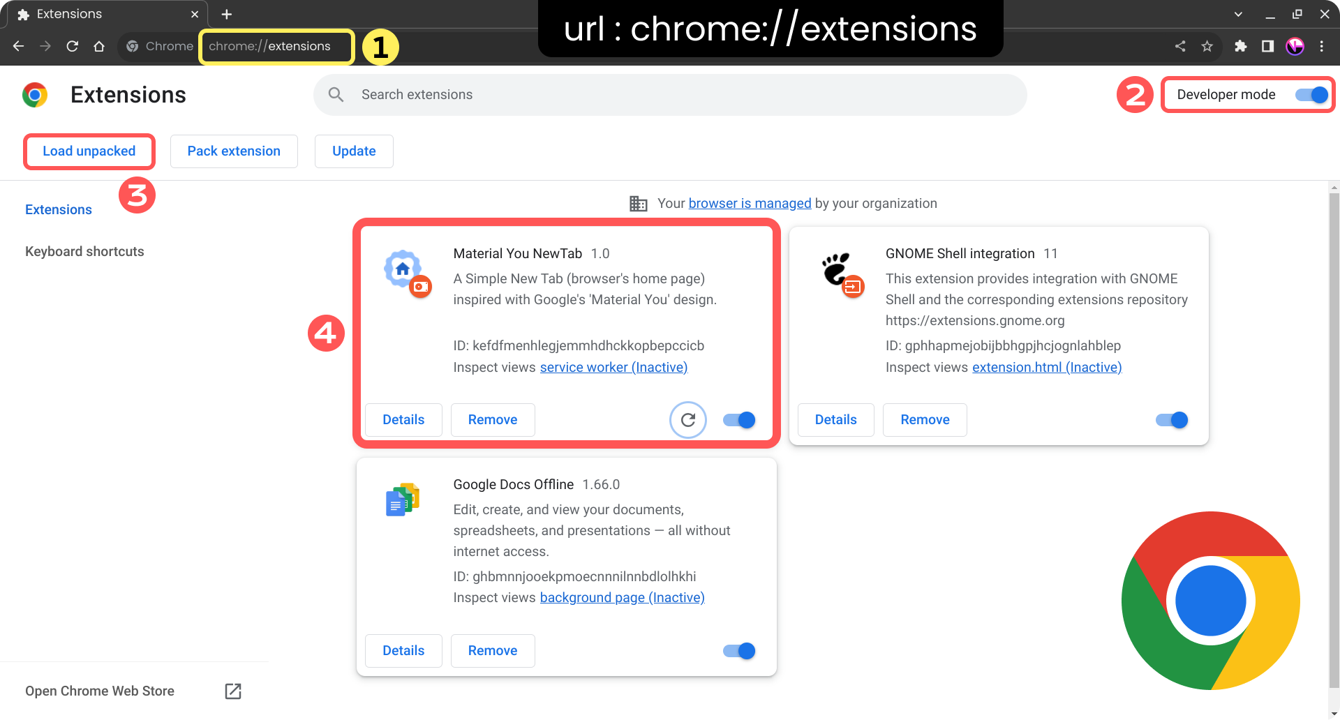 - Turn on Developer Mode in the extensions page.