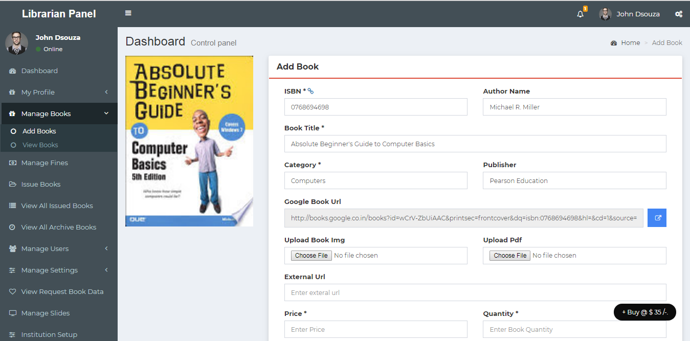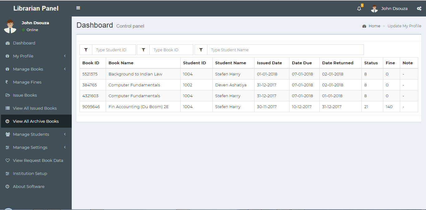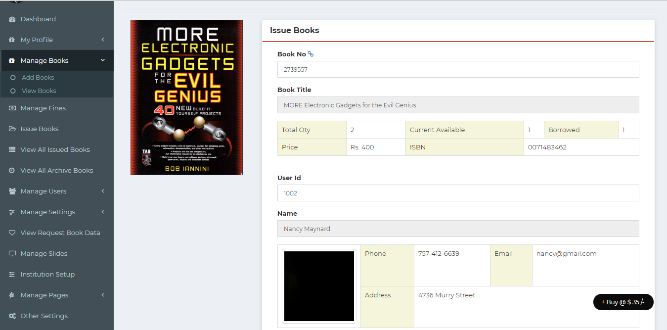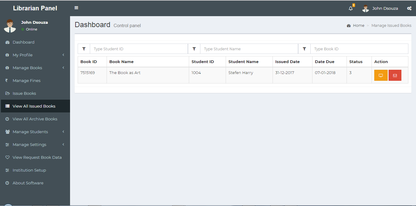 These are all the list of books that are available in the library.If Any books goes out of stock then status (All Issued) will be shown to the students.He can also see a preview of these books via(Google Book Api)