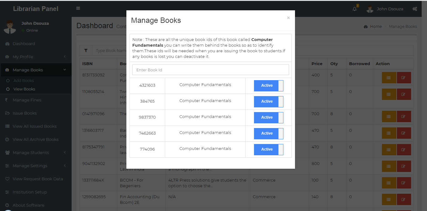 The numbers shown (it's the book id) needs to be written behind each books.Since its used to identify each books.No barcode feature is used since it can increase overall cost.