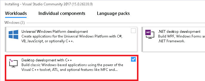 Note: Visual Studio doesn't install C++ by default. If you already have it installed then you have to rerun the setup and check Desktop development with C++.