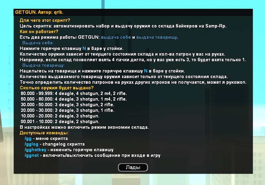 Скрипт автоматизирует взятие оружия со склада байкеров на Samp-Rp.
