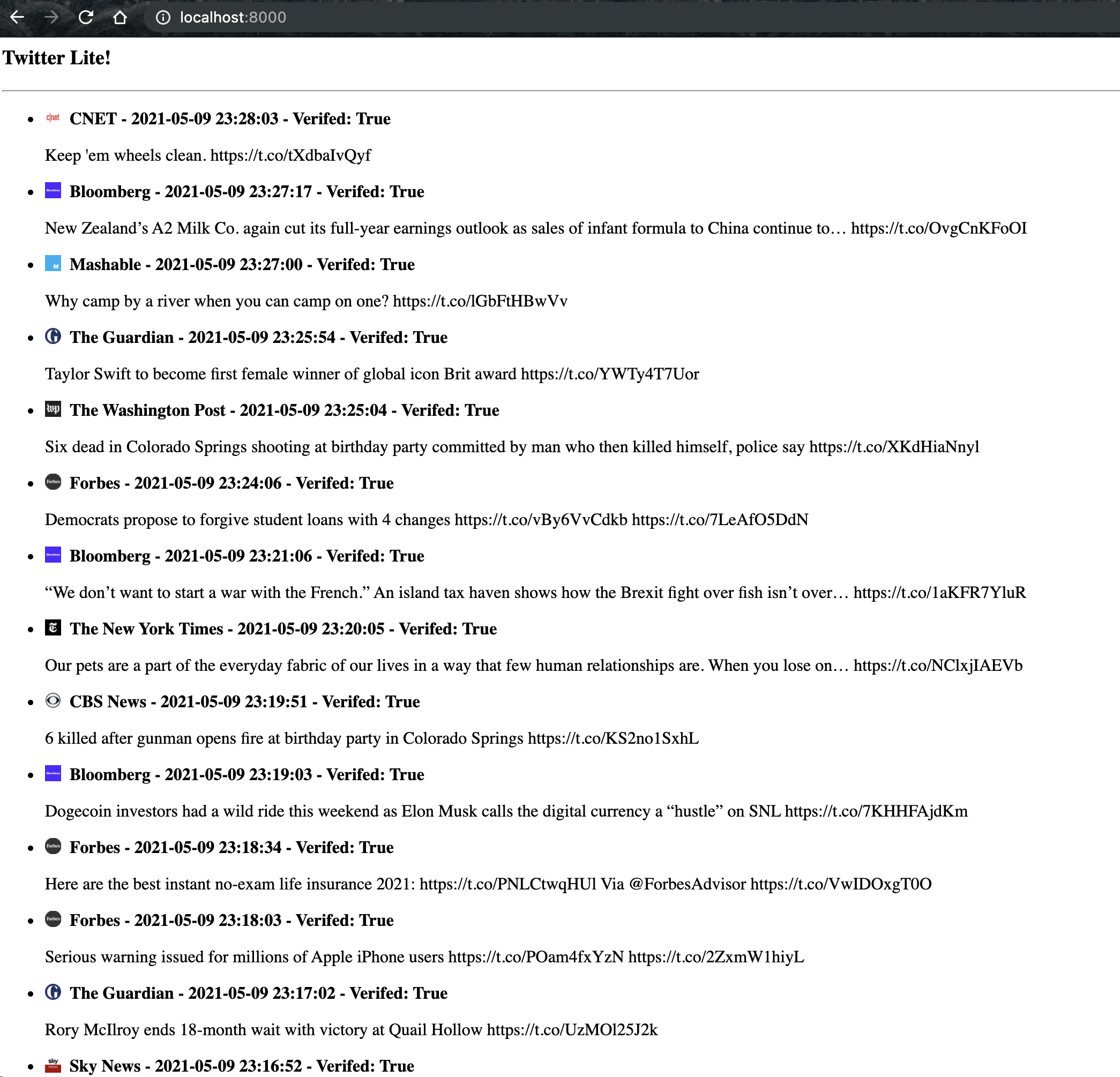- With these installed, you can now run python3 Main.py in your terminal and visit http://localhost:8000 in your browser to see your own configured TwitterLite :)