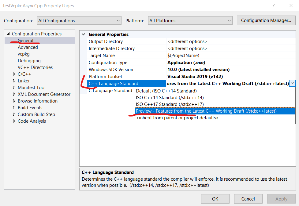 Remark: If you need legacy await support (the /await compiler switch is used, coroutines are in the std::experimental namespace), install Rstein.AsyncCpp library using the following command.