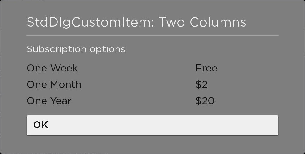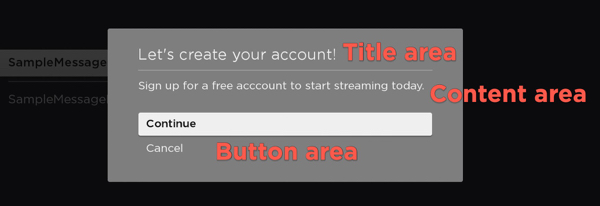 As part of the Roku OS 10.0 release, Roku's standard dialog framework enables developers to use new pre-built modal pop-up dialogs and build custom ones. Dialogs are used to display information to users that require their immediate attention (for example, selecting a subscription product, entering credentials or account information, informing the user that a screen is loading, and so on).