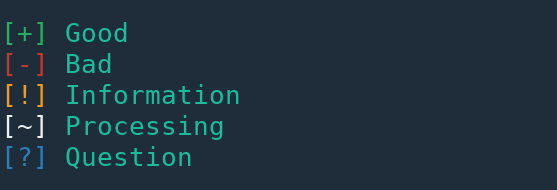 blue, lightblue, purple, light purple, orange, yellowbold, bg, under, strike, italicinfo, que, run, bad, goodNote: Windows versions below windows 10 do not support ANSI escape sequences so the colors will not be printed in command prompt.