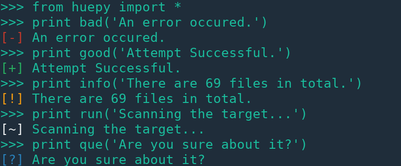 from huepy import *Printing colored text is as simple as doing