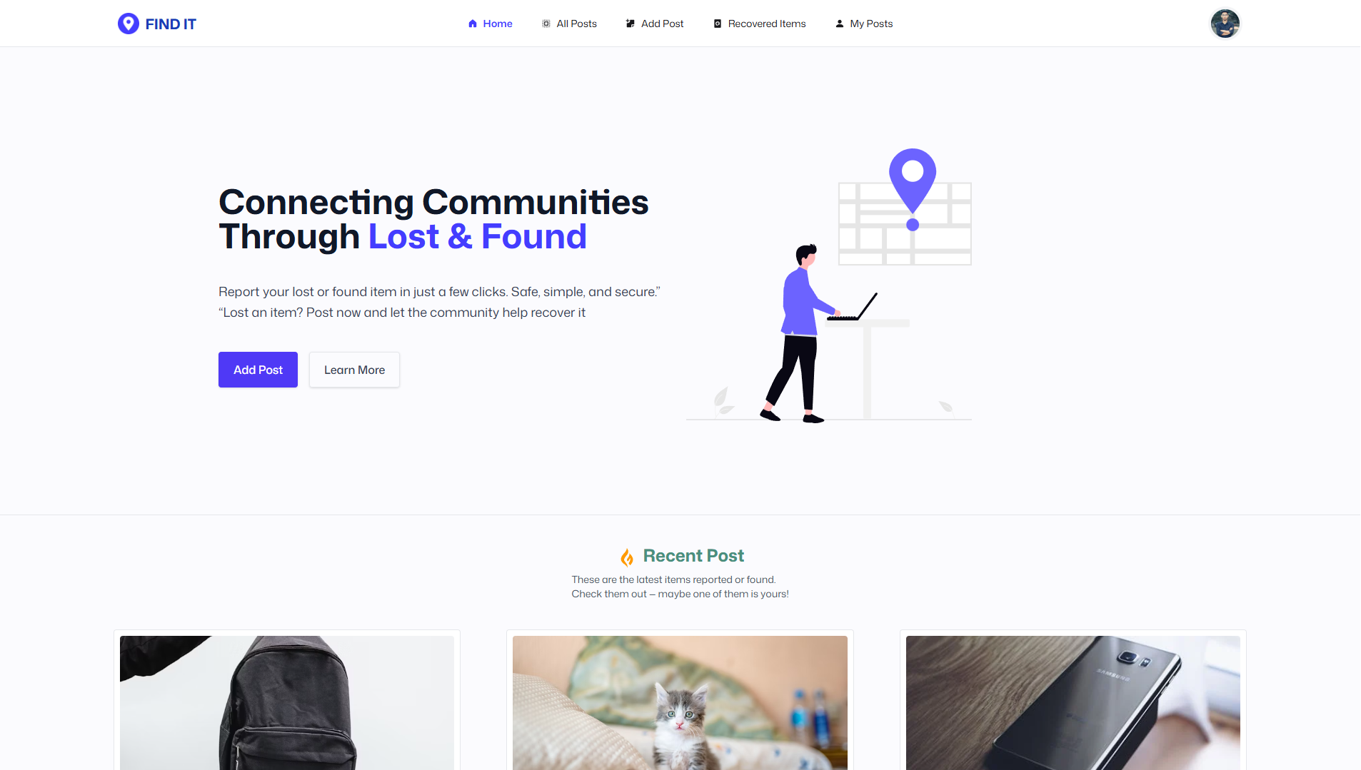 FindIt is a full-stack web application that helps users report lost items and recover found items. Designed to connect people quickly and efficiently, it supports secure authentication, user-friendly interfaces, protected routes, and powerful search and CRUD functionalities.