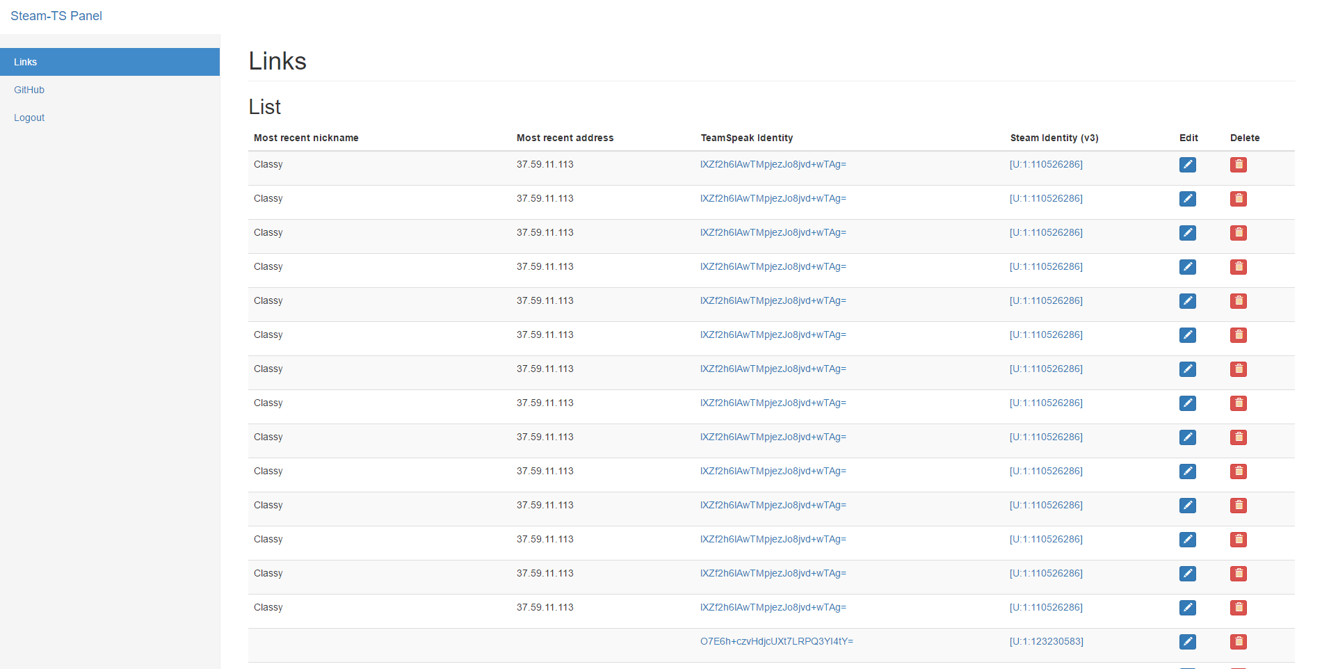 As soon as this NodeJs app is launched your Steam bot will automatically log into Steam and log into your TeamSpeak server query and it will then start listening to the !verify command in the Steam chat. When someone writes !verify to the Steambot, it will prompt the user to give their TeamSpeak username which they are currently recognized by on the given TeamSpeak server. When the given username was correct it will message the TeamSpeak client under that username a randomly generated token and it will tell the user to send that string back to the Steambot. When the bot has successfully compared both strings it will write to a file called verified.json. This json file contains an array called users wherein each element represents an object of a verified user. This module is good for preventing users from evading their bans by creating new TeamSpeak identities, if they want to get rid of the default guest rank they would need to verify themselves and it generally is not as easy to create a new Steam account and get it up to a relatively high level again.