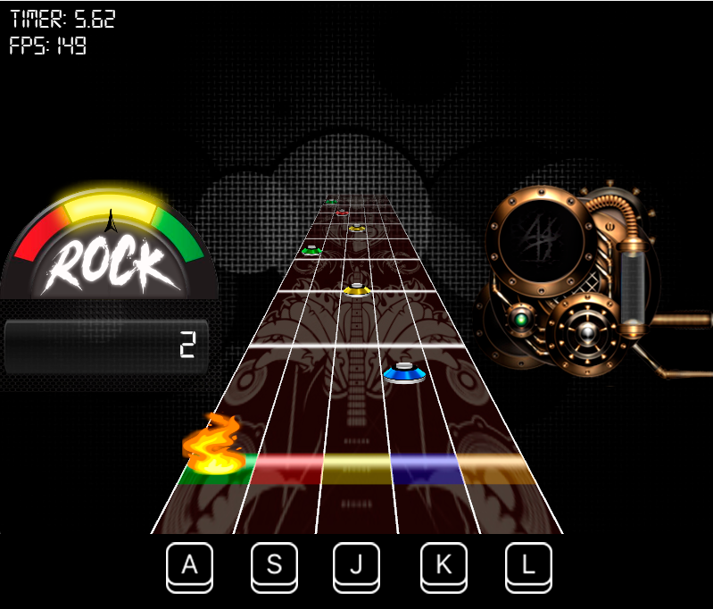 The A, S, J, K and L keys must be pressed according to the color of the note that is in the "detector". They respectively control the green, red, yellow, blue and orange notes.