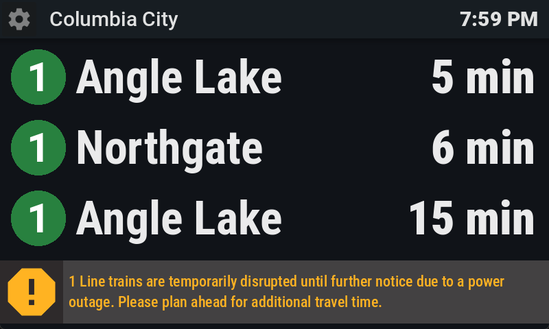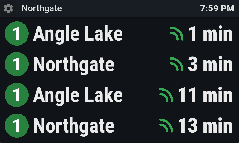 This is a Godot 4.3 project. Binaries may or may not exist yet in the releases section of this repo. If not, you will need to launch the Godot project yourself and export to your desired platform. On an older version, a OneBusAway API key was required; however this is no longer required as the app uses a proxy server instead. This proxy server caches requests made to the OneBusAway API for 30 seconds and, as of right now, has a (fairly) strict rate limit. If you would like to use this for your own projects besides simply running an arrivals board, please run your own proxy server!