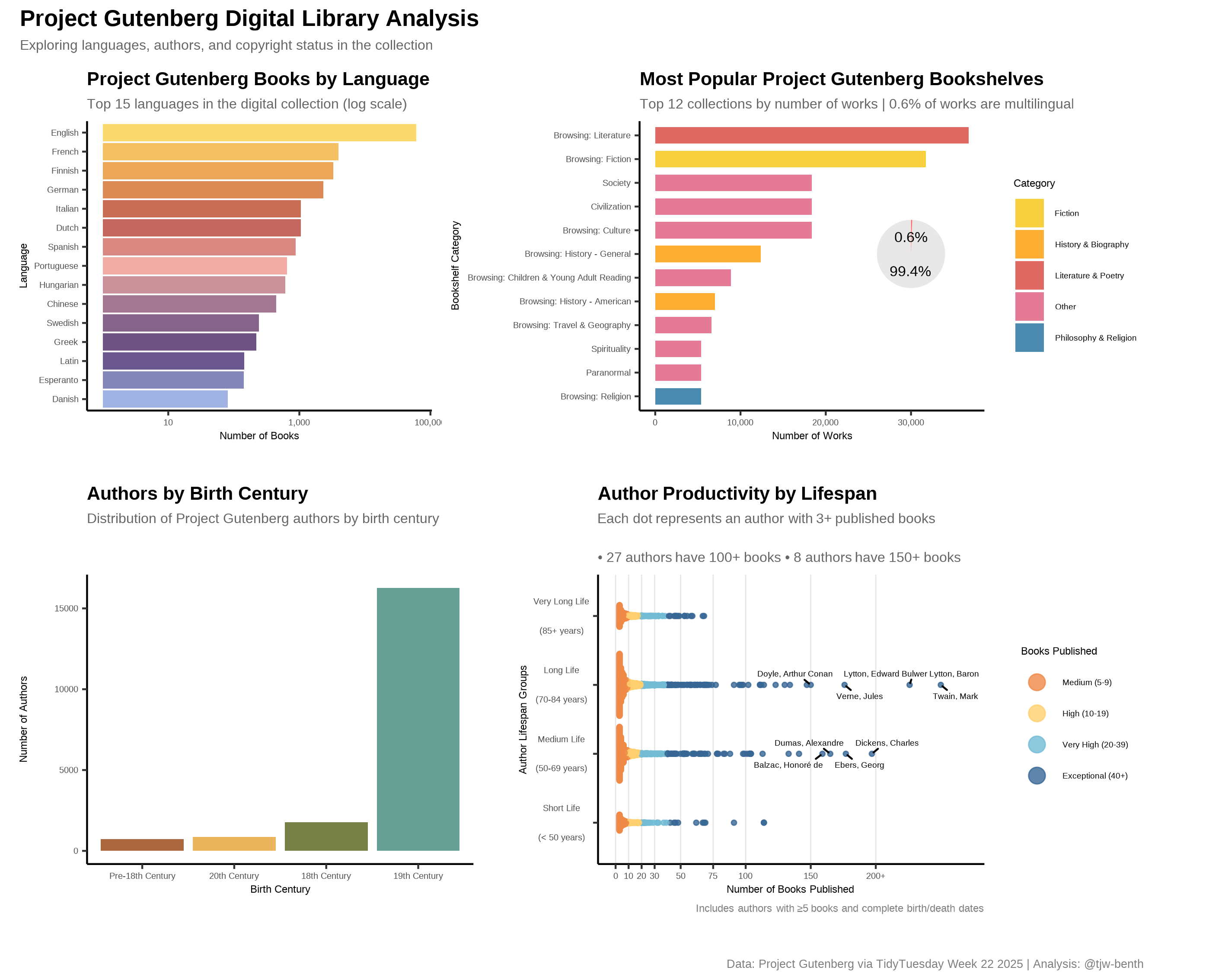 Analysis of Project Gutenberg digital library collection using Tidyverse and ggplot2.