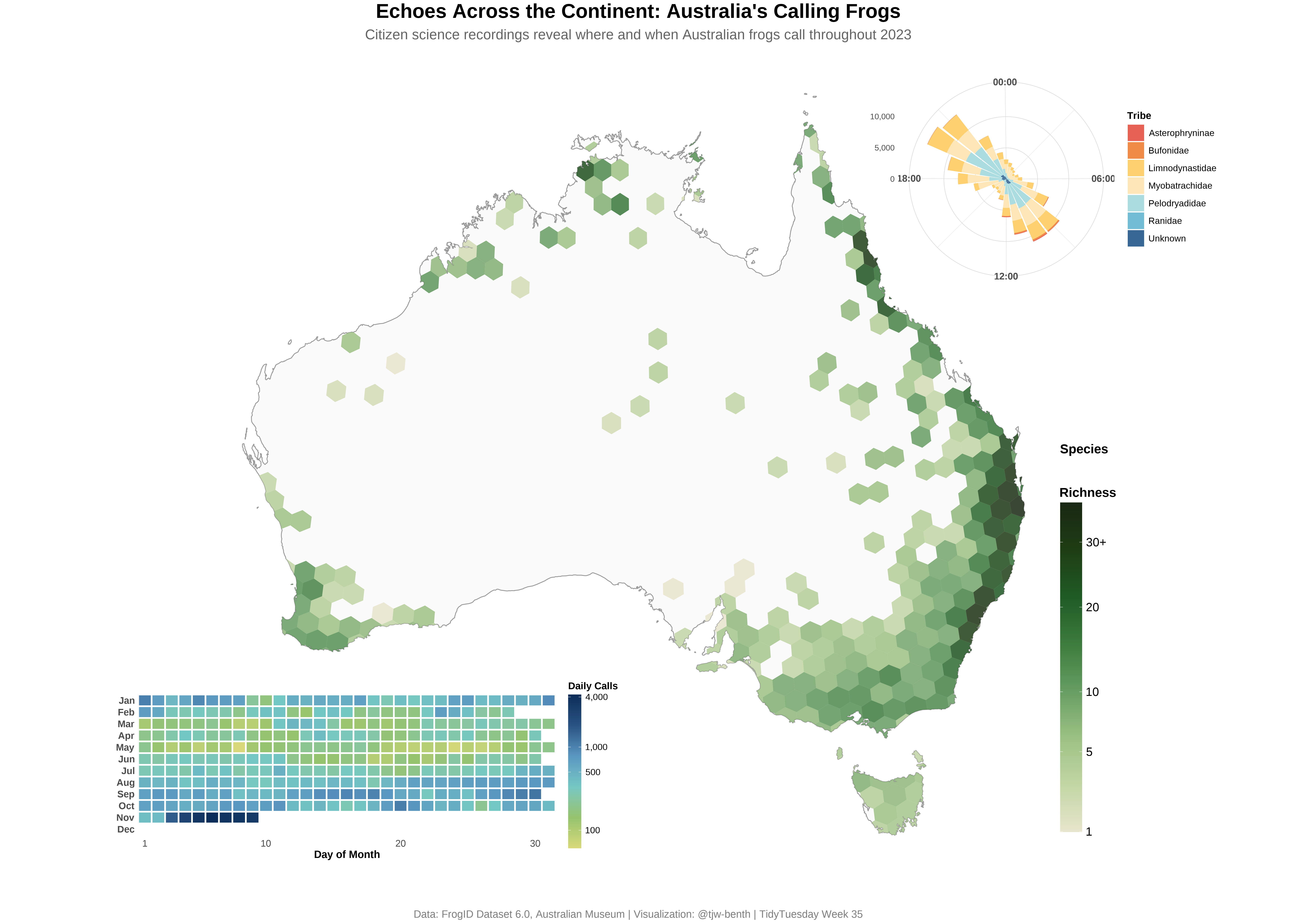 Spatial and temporal analysis of nearly 140,000 citizen science frog recordings across Australia from the FrogID Dataset 6.0, revealing species richness patterns, daily calling rhythms, and seasonal activity trends.