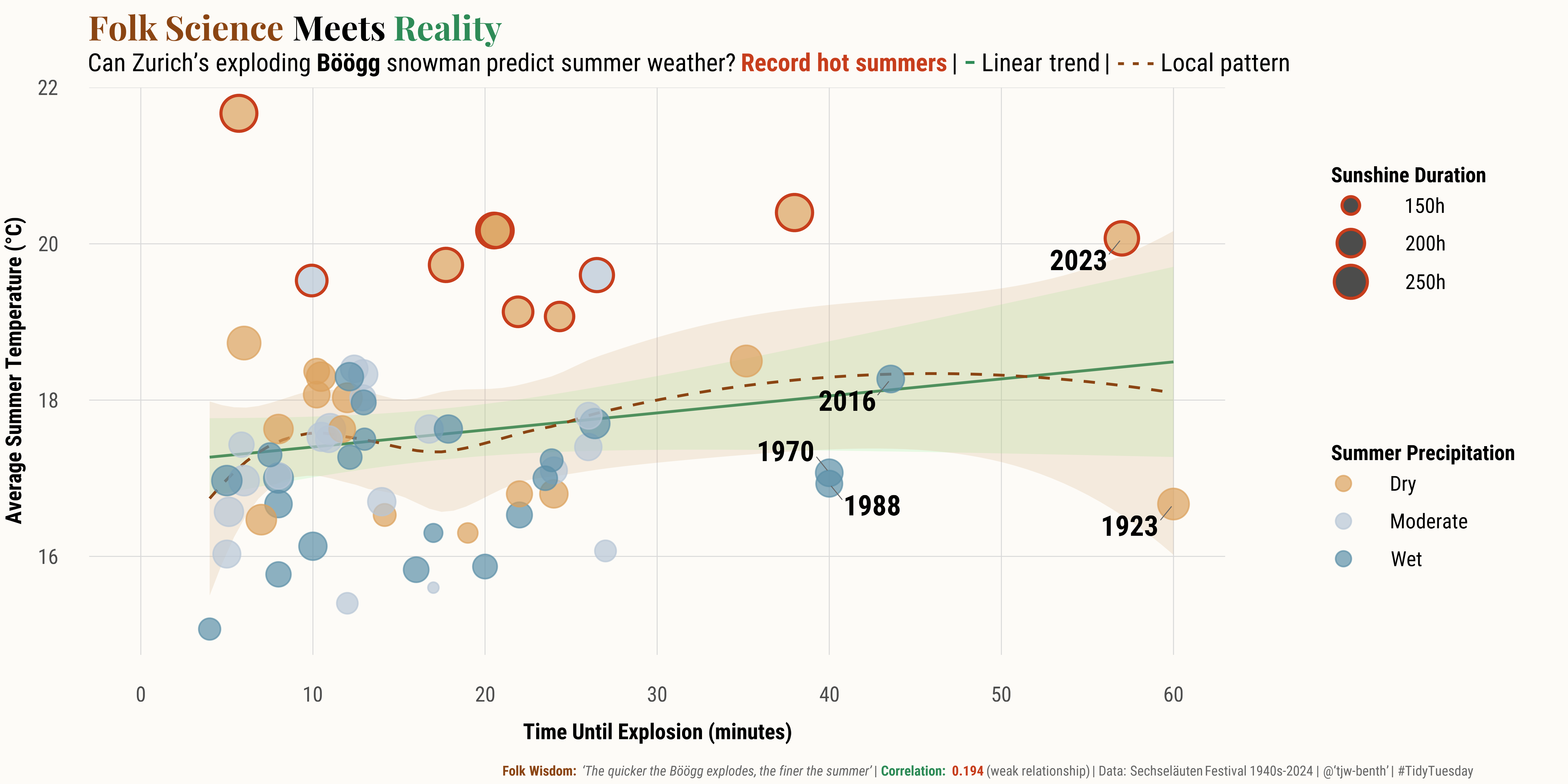 Analysis of the Sechseläuten festival tradition - testing if Zurich's exploding Böögg snowman can predict summer weather using correlation analysis and visualization.
