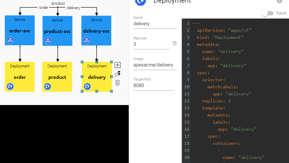 아래처럼 3개의 Deployment 객체가 정의되어 있을 때, 3번째 객체인 'delivery'를 선택하여 배포하게 되면,,  Terminal windows에 입력되는 YAML Spec.은 선택된 'deliveries'가 아닌, 첫번째 객체인 'order'에 대한 정보가 입력되어 중복 오류가 발생한다.