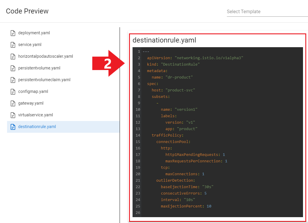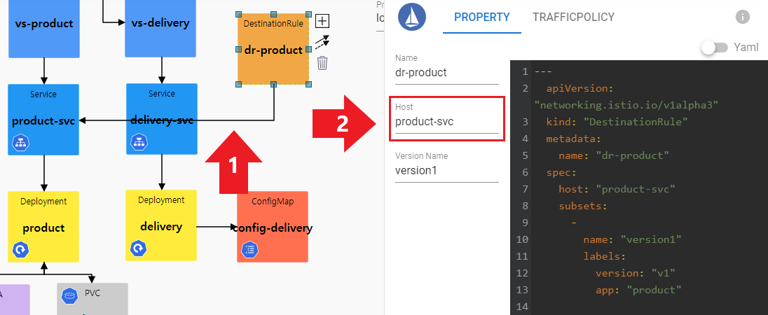 - 연결선이 생기면 dr-product 객체를 더블클릭하여 spec.host에 Service 객체의 Name: product-svc 가 주입되었는지 확인합니다.