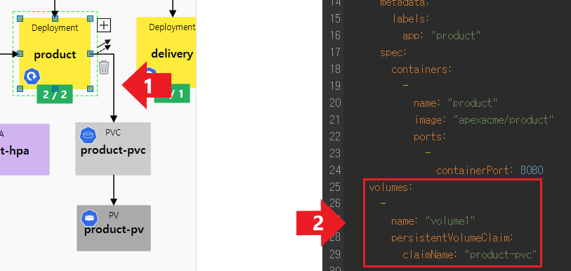 - 연결선이 생기면 Deployment 객체를 더블클릭하여 spec.volumes에 PVC 객체가 있는지 확인합니다.