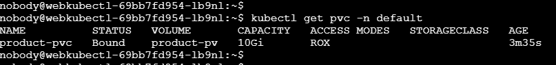 - kubectl get pvc 명령어 입력 후 PVC 객체가 정상적으로 배포되었는지 확인합니다.