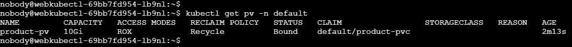 - kubectl get pv 명령어 입력 후 PV 객체가 정상적으로 배포되었는지 확인합니다.