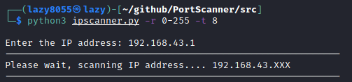Here, the range is from 0 to 255, number of thread is 8 and the ip address is 194.165.43.2
