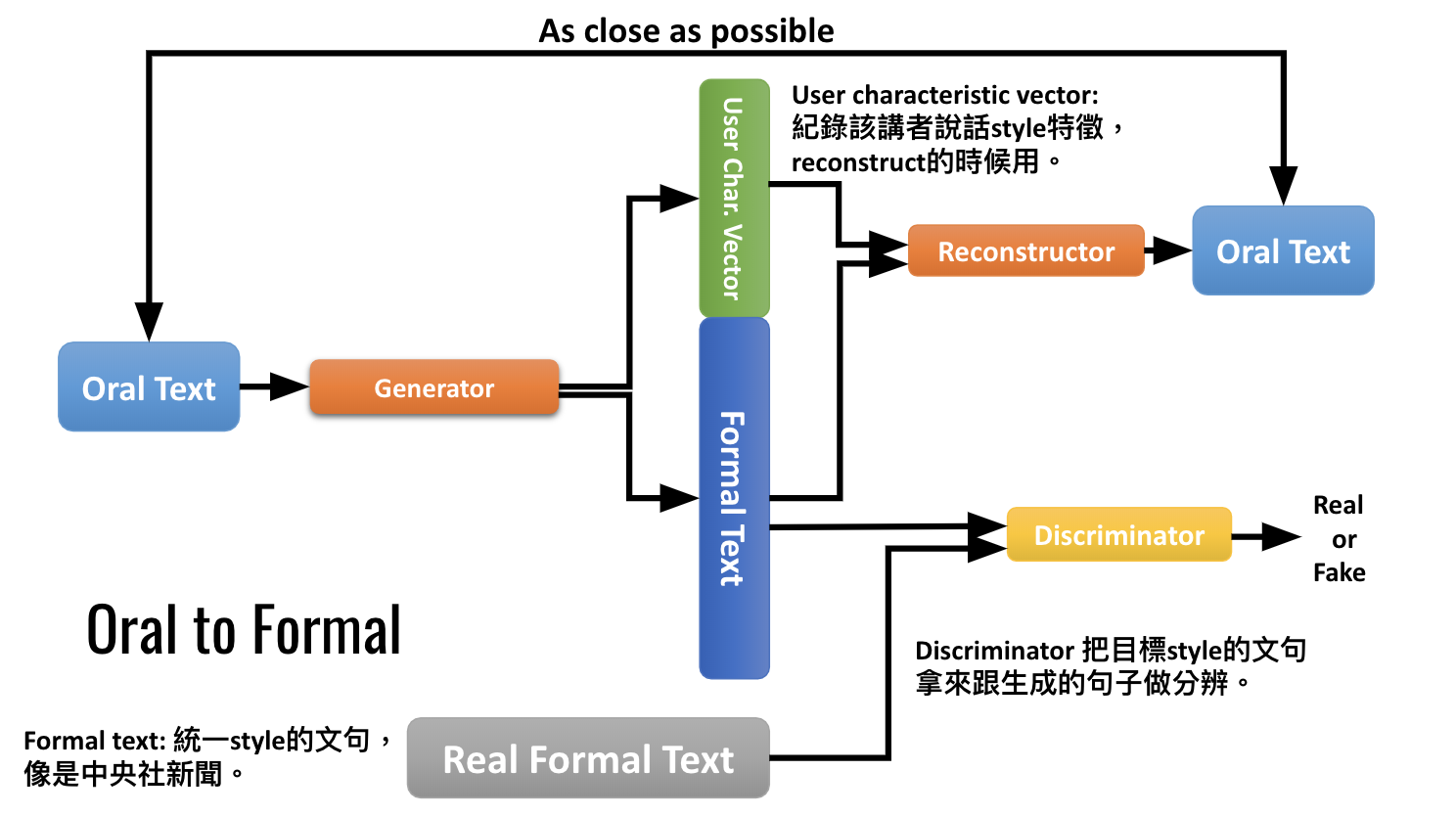 Transformer_CycleGAN_Text_Style_Transfer-pytorch Implementation of CycleGAN for Text style transfer with PyTorch. CycleGAN Architecture Model Detail We simply use softmax weighted sum over all word vectors to overcome the discrete gradient issue in GAN training process.