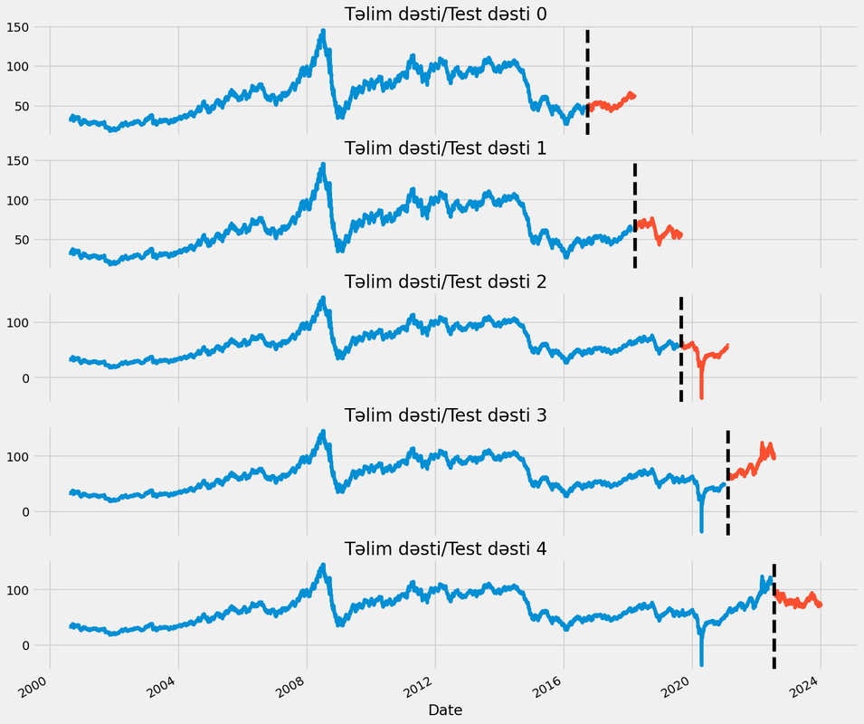 Sonra müxtəlif vaxt seriyası məlumat dəstlərinin ardıcıl təlim və test dəstlərinə bölmək yolu ilə zamanla necə dəyişdiyini vizuallaşdırırıq