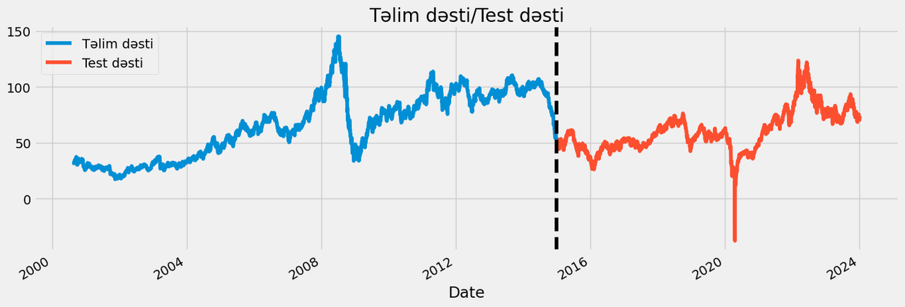 Sonra əldə edəcəyimiz modelin dəqiqliyini yoxlamaq üçün, keçmiş qiymətləri Test və Təlim dəsti olaraq iki yerə bölürük