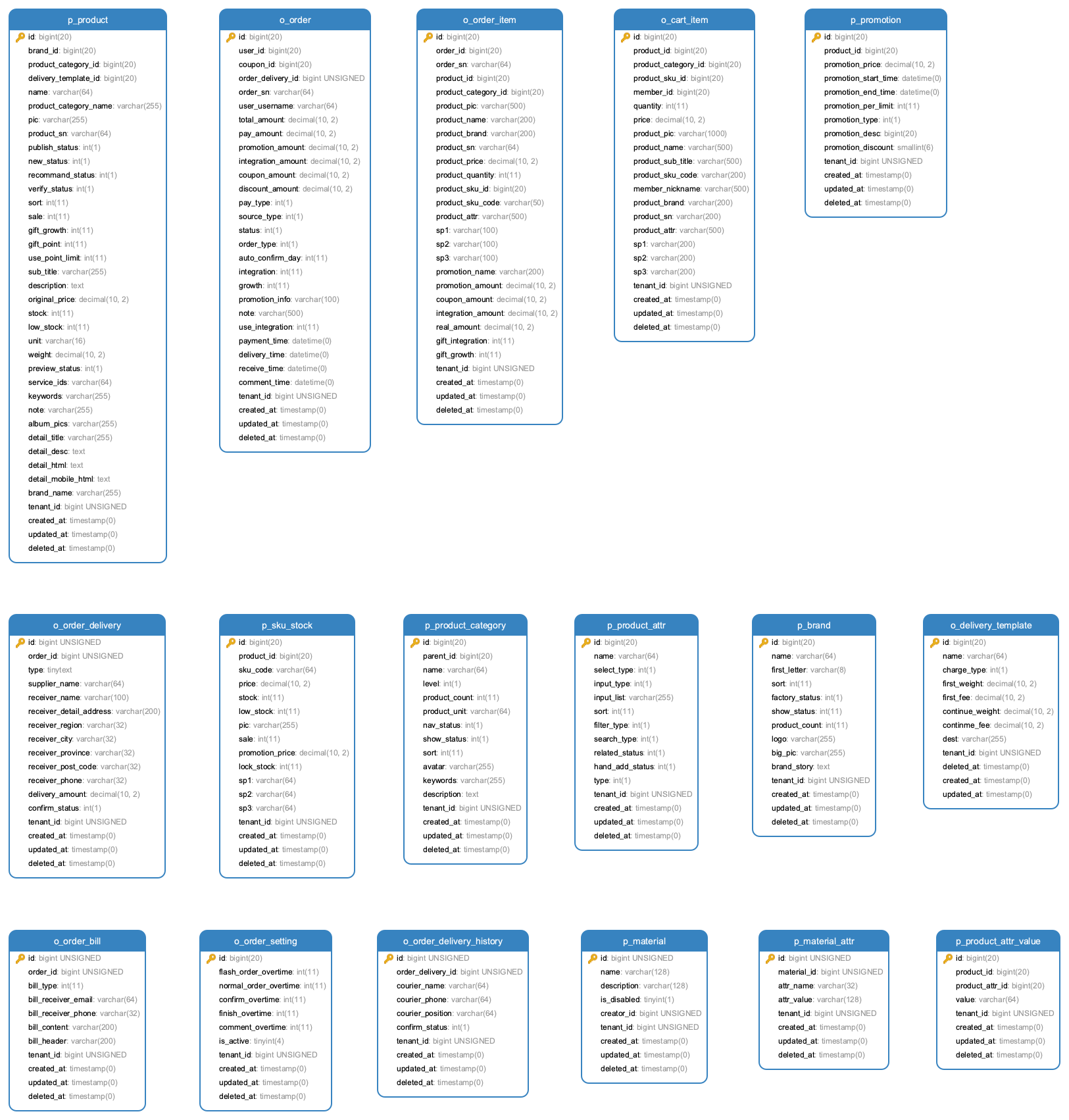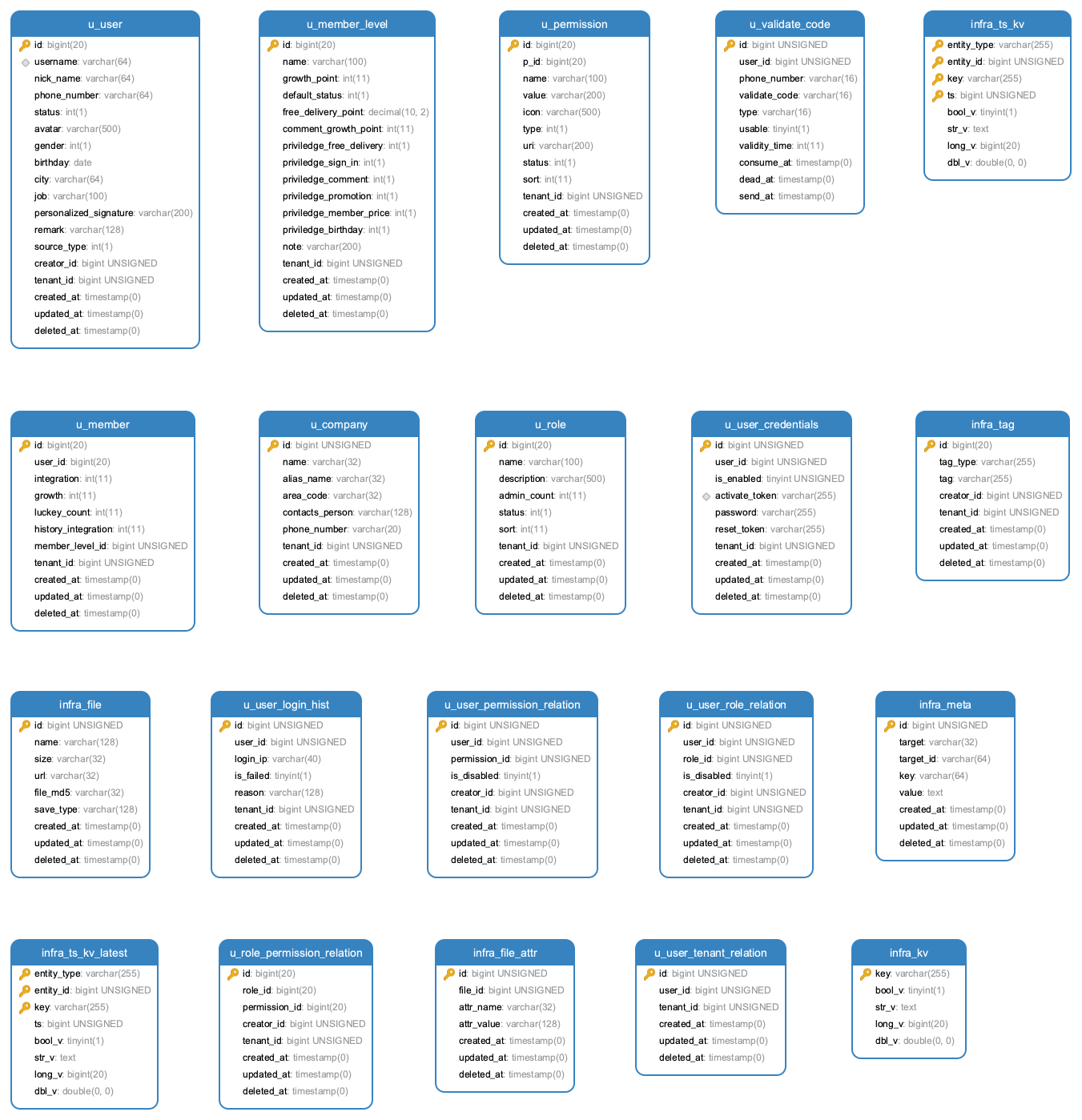 元信息字段:每张表中都存有 created_at, updated_at, deleted_at 三个元信息字段,所有涉及判断是否更新、是否删除的都会依据该信息。