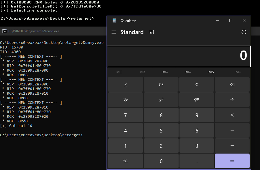 0xeb, 0xfe(jmp $) loop. The PoC utilizes a static address fromkernelbase.dll. - A big enough RWX memory region to replace the stack with (1MB will do). In this PoC, the memory is allocated via