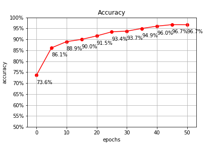 After 50 epochs of training with learning rate equal to 0.0007 network reached 96.7% accuracy on test dataset