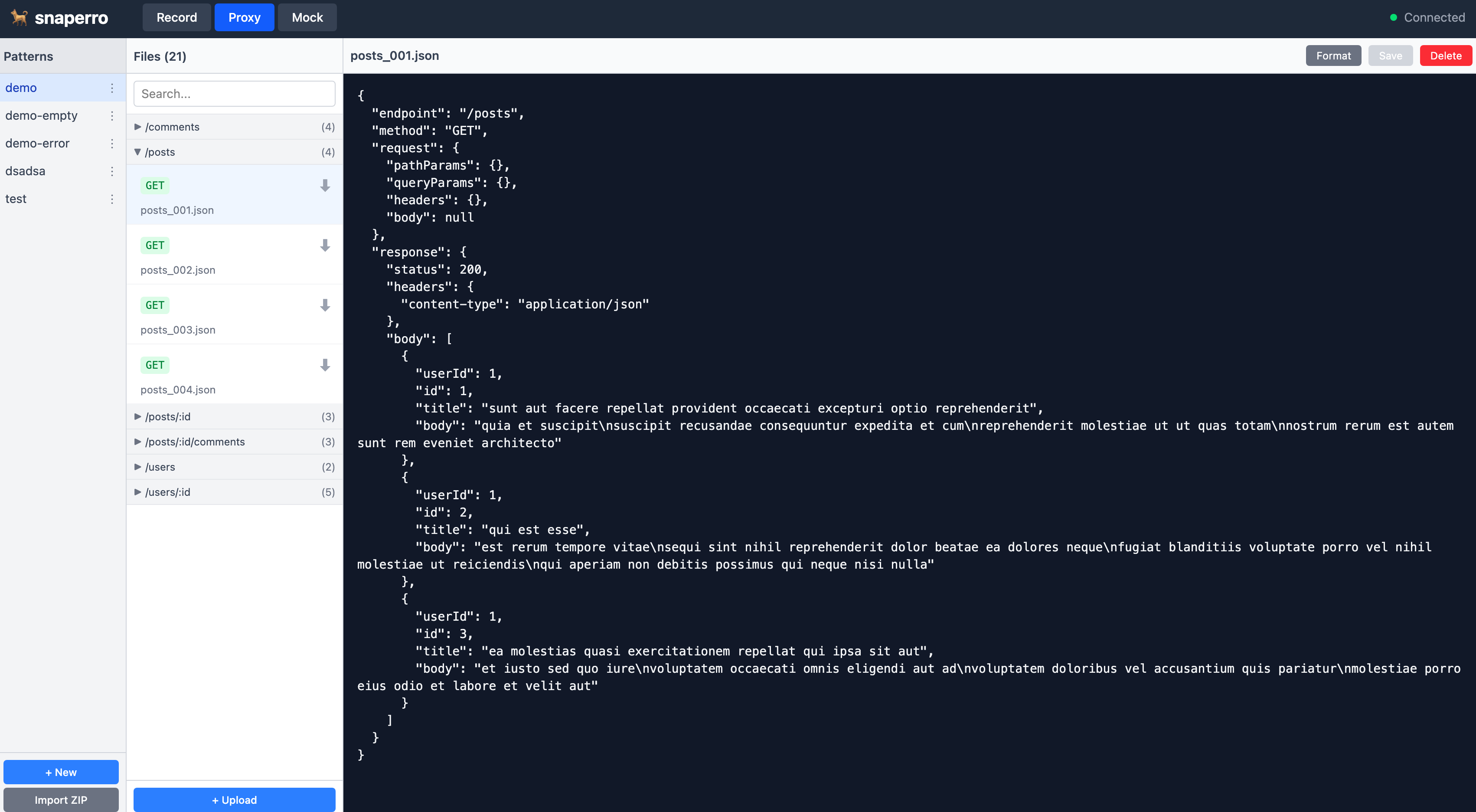 snaperro is a mock proxy server that saves API responses as "snapshots" and can replay them anytime.